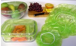 These are literally different sized shower caps, which is fine because that's what I was looking for. I couldn't find shower caps locally. My grandma always used them in lieu of cling wrap. I decided I wanted to try the same to try and cut back on plastic wrap. They work well. The 3 sizes stay on various conatiners nicely and are easier to position and reposition than plastic wrap. The only gripe I have about them is that they are a wee bit pricey for what you get, you'll have to eliminate the purchase of 3 rolls of plastic wrap to break even/save waste. Also, they're hard to dry once washed. You pretty much have to dry one side, then flip it and let the other side dry. I'll update the review later if I have any problems and post how many uses I'm getting out of one of these. I think they should last a while though as the elastic is pretty decent quality.
