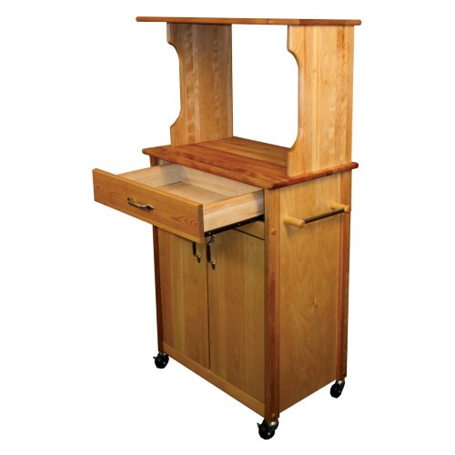 Title : Catskill Craftsmen Microwave CartDescription : Catskill Craftsmen has become the nation's leading manufacturer of ready-to-assemble domestic hardwood kitchen islands, carts, and work-centers. Catskill Craftsmen manufactured items are made from naturally self-sustaining, non-endangered North American hardwoods, primarily Northern Yellow Birch. Lumber is purchased from area sawmills, then dried, manufactured, and packaged on site. All sawdust, shavings and waste materials generated during the manufacturing process is converted into wood pellet fuel, and used to heat homes. A rugged kitchen cart featuring domestic hardwood top, braces, legs, doors and drawer. Finely matched warp-resistant veneer side and back panels finish out the sturdy construction. The microwave shelf allows use of this important appliance while not stealing precious counter space within the kitchen. Additional features include towel bar, locking casters, nickel-plated hardware and an oil finish. Assembly Required.