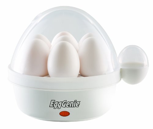 Description : Egg genie electric egg cooker cooks up to seven eggs at the same time, choose from soft, medium or hard-boiled. Simply place eggs into the egg genie, add the required amount of water using t he provided measuring cup and turn the unit on. The steam will cook the eggs, so you can have perfectly boiled eggs every time. Amount of water controls cooking time, alert lets you know when the eggs are done. Make a breakfast favorite, create delicious appetizers or a nutritious snack in no time.