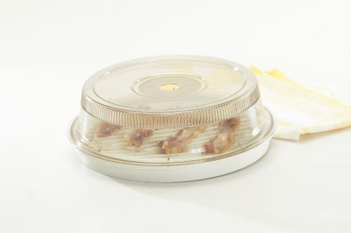 Title : Nordic Ware 65004 11-Inch Microwave Plate CoverDescription : Fits dinner plates up to 11 inches and the Nordic Ware 2-sided Bacon-Meat Grill. Allows you to view food without spatters in the microwave. Prevents spatters in microwave and keeps food warm for serving. Clear see-thru plastic to view food as it cooks. Proudly made in the USA.Concentrate heat around microwaved food and keep it moist with this transparent, high-domed plastic cover. Because it protects against splattering, it's a useful accessory for Nordic Ware's two-sided round microwave bacon/meat grill. The cover fits dinner plates up to 11 inches in diameter. It also enables two plates of food to be cooked or warmed in a microwave at once: cover one and stack the second atop the cover. The cover is virtually unbreakable and is safe in the freezer and dishwasher. --Fred Brack