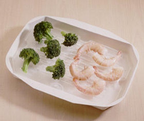 Title : Nordic Ware Microwave Vegetable and Seafood Steamer 11 Inch by 8.6 InchDescription : The Vegetable/ Seafood Steamer has a lid with a steam release vent. The removable trivet raises food for steaming vegetables. Gemstone is more efficient in transmitting microwave energy to the food than most glass or ceramic ware. This means even cooking and baking, less stirring and rotating and fewer hot and cold spots. This durable and chip proof pan will never melt or warp and is designed for freezer to oven to table to dishwasher use. This Vegetable/ Seafood Steamer is a versatile addition to any kitchen. Proudly made in the USA by Nordic Ware.