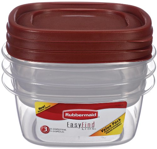 Title : Rubbermaid 7J95 Easy Find Lid Medium Value Pack Food Storage ContainersDescription : The Rubbermaid Easy Find Lids Medium Value Pack includes (2) 3.0 cup Easy Find Lid containers measures 7" x 7" x 2.3"and (1) 5.0 cup Easy Find Lid container measures 7" x 7" x 3.4". The number one unmet need for food storage is container and lid organization. With Rubbermaid's new Easy Find Lids you'll find storage and organization a breeze! The Easy Find Lids snap together as well as snap to the bases for easy storage. The Easy Find Lids and bases also nest together making storage in a cabinet or a drawer much more efficient. Easy Find Lids are square in shape and allow for easy of stacking when placed on shelves or in the refrigerator. Rubbermaid Easy Find Lids also feature a super clarified base which takes the guessing out of what's inside and allows you to see what's inside quickly and easily. Rubbermaid Easy Find Lids and bases are also microwave, freezer, and dishwasher safe.