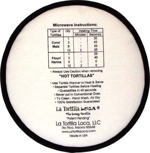 Title : Tortilla Warmer, Microwave Safe, Chili Under the Sun, StyleDescription : Tortilla Warmer is 11" diameter and can be safely used in the microwave and is washable. Will last for a very long time. Designed to hold one dozen flour tortillas or corn tortilla. Printed on the backside are instructions on how to use.